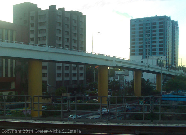 Shot taken while riding the MRT heading to Taft Avenue. The vicity is the intersection of EDSA and Ortigas Avenue. Prominently seen in this picture are the buildings Sta. Lucia Realty and Columbia Tower as well as the flyover going to San Juan City. The building that was not captured completely on the left is the POEA Blas Ople building.