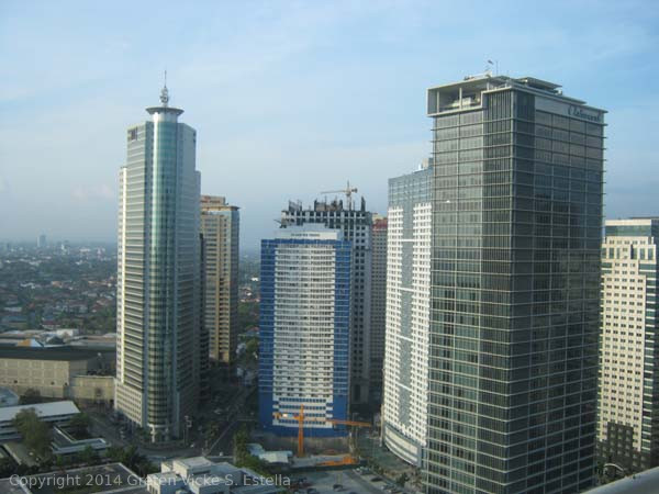 Some of the buildings that I can identify in this photo are Robinson Equitable Tower (highest building on the left), Crowne Plaza Hotel (brown building behind Robinson Equitable), City & Land Megaplaza (blue and white at the center), Oakwood Premier Manila (the tall one on the right closest to the foreground) and East of Galleria (between Oakwood and City & Land).