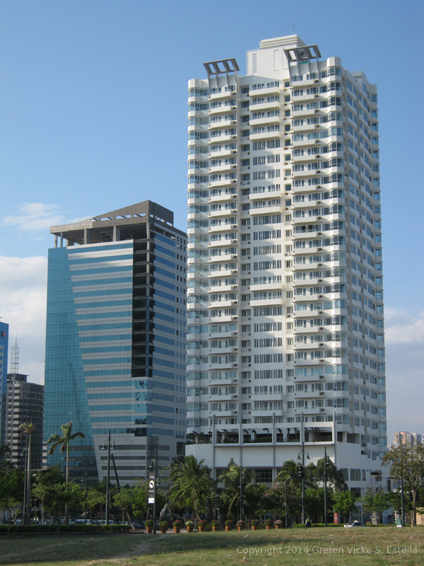 The bluish building on the left is One Global Place situated at 5th Avenue cor. 25 St. The taller white building is Seibu Tower located at 24th St. cor 6th Avenue. This photo was taken from the 21st Drive near the oval road.